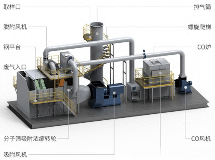核心工艺:干式过滤+沸石转轮+CO(催化燃烧),处理效率99%+